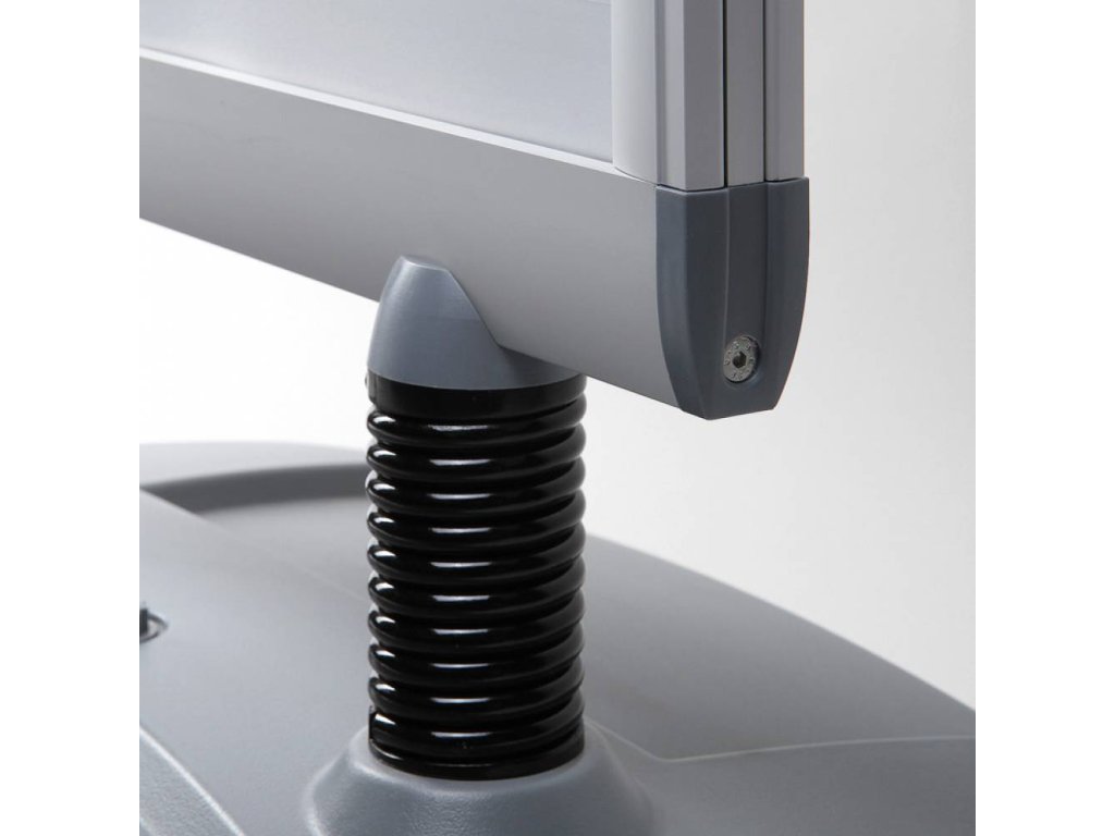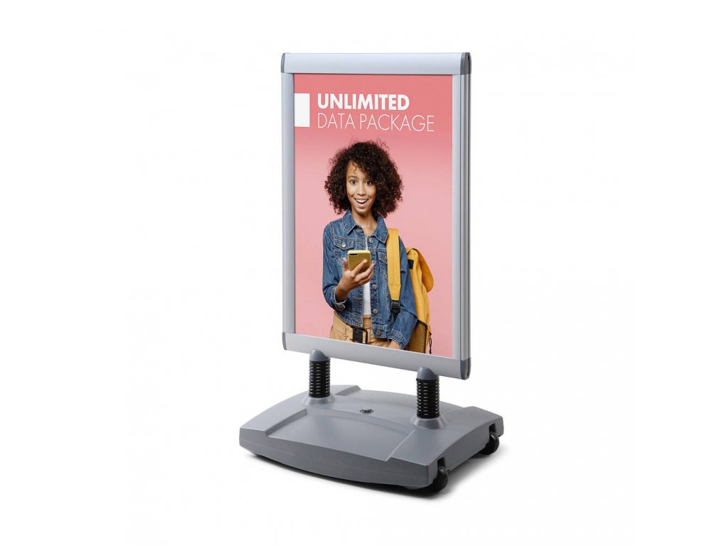 Venkovní Windtalker Excel s plnitelnou plastovou základnou pro zajištění nejlepší stability při nepřízni počasí. Windtalker disponuje bezpečnostními plastovými rohy ze vstřikovaného plastu a základna je vybavena kolečky pro snadnou manipulaci. Poutač má zaklapávací profily na svislých stranách a UV stabilní antireflexní krycí fólii pro větší odolnost plakátu. Tento reklamní venkovní poutač má vyztužené pružiny z vysoce kvalitní oceli a nárazuvzdorný středový panel. To vše pro zajištění dlouhé životnosti poutače.