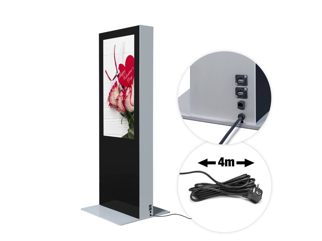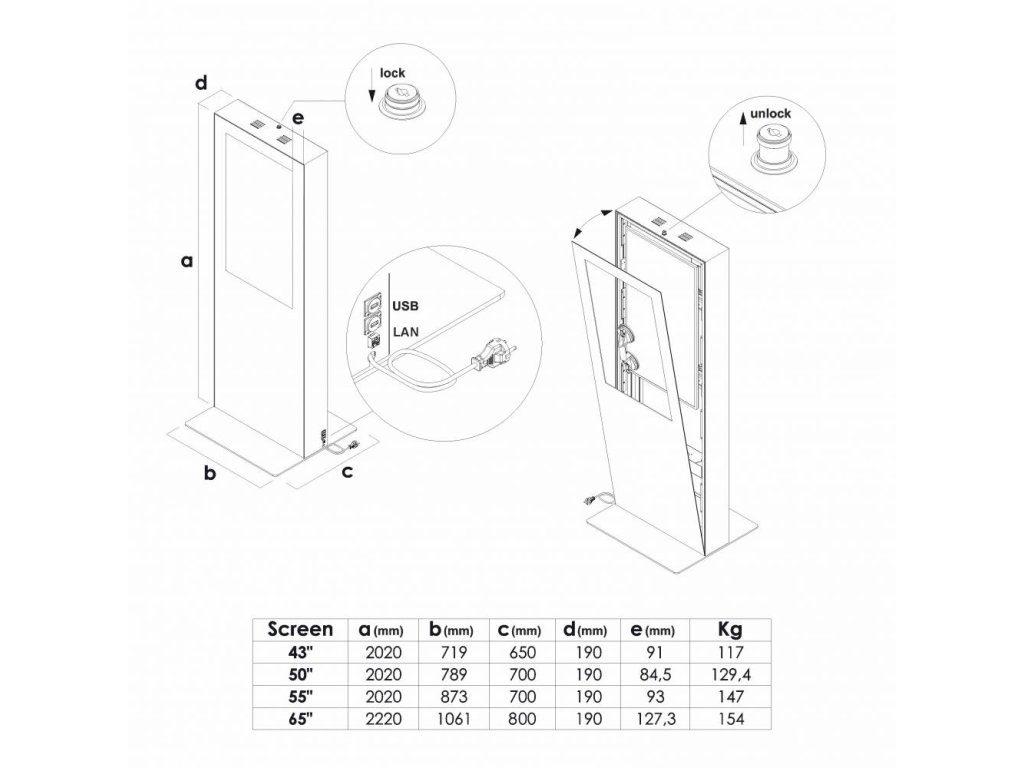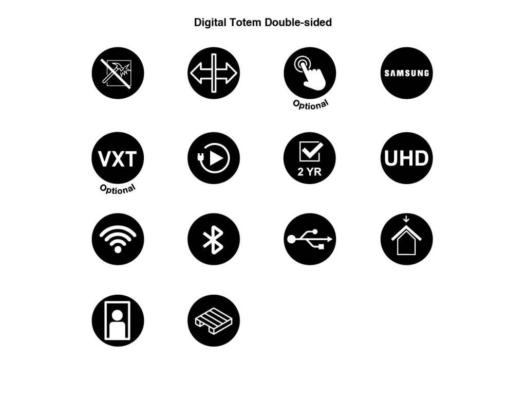 Digitální totem se 2 obrazovkami je ideálním řešením pro haly, vestibuly, nákupní centra, velké obchody, sportovní centra, veřejné prostory a další. Profesionální obrazovky Samsung jsou plně zakryty a chráněny proti vandalismu. USB a WiFi pro snadné přehrávání obsahu. Možnost aplikace dotykové fólie pro interakci se zákazníky.- Oboustranná zabezpečená vnitřní prezentace.