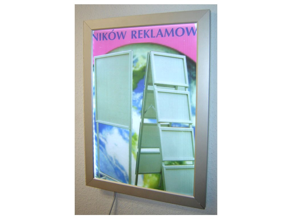 Uzamykatelný plakátový rám 700x1000 B1 jednostranný s osvětlením LED 12V (příkon 2,5 W), studené bílé LED 9000K. Použito 72 ks LED / mb. Použití v interiéru. Eloxovaný alu profil 35mm. Laserově glavírovaný mléčný akryl 4mm. Vložený materiál je chráněn antirefUV folii 0,4, nebo lesklým Axpetem 0,8mm. Výhodou je malá hloubka rámu 20mm.