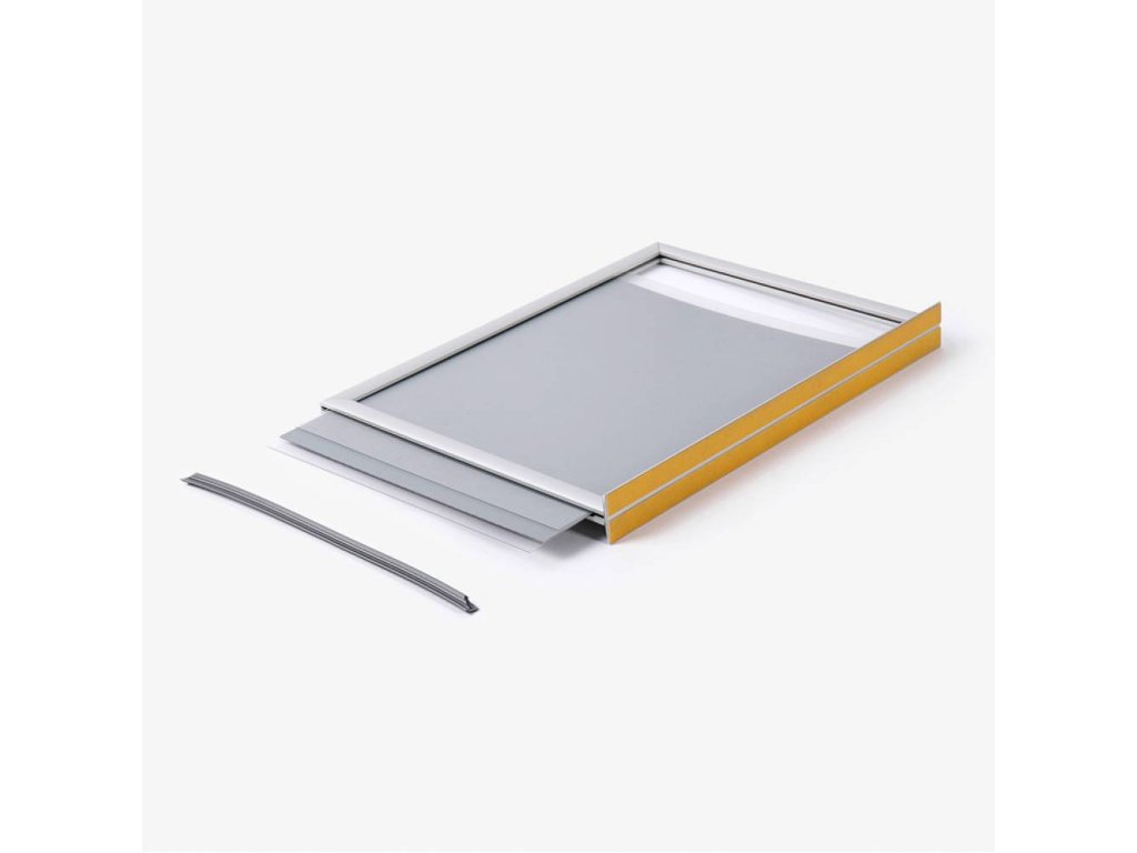 Oboustranný zasouvací rám o velikosti A4 disponuje základnou pro snadnější umístění a manipulaci. Jednoduchý design s 20 mm profilem je skvělým řešením pro oboustrannou prezentaci. Dodáváme se speciální kvalitní lepící páskou upevněnou na spodní straně základny.